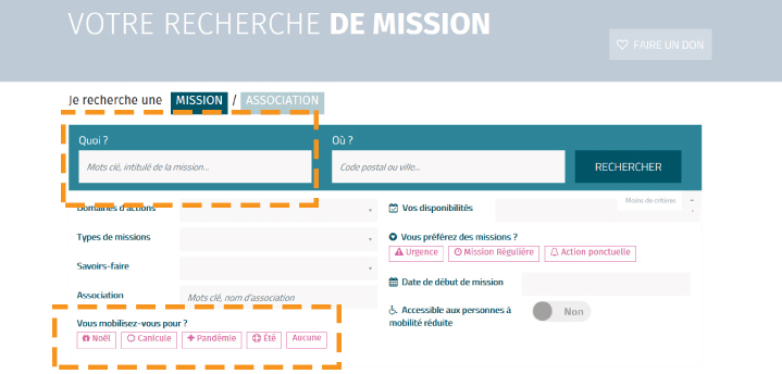 Via le moteur de recherche de missions bénévoles, saisissez votre ville (ou votre région), tapez le mot « Noël » dans la case « Quoi ? » et toutes les missions bénévoles au moment des fêtes de fin d’année apparaissent automatiquement. Vous pouvez également sélectionner le type de mobilisation (Noël). Vous pouvez affiner votre recherche en précisant le domaine d’activité et/ou le type de mission.
